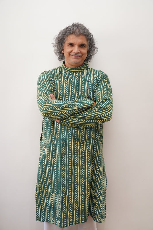 Hand Block printed men's long kurta green colour